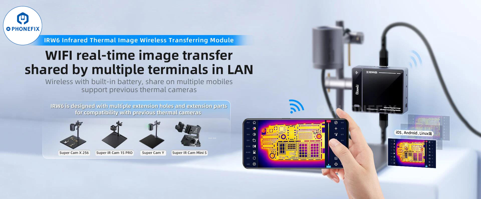Qianli IRW6 Infrared Thermal lmager Wireless Transferring device for use with previous thermal cameras. QianLi Super Cam Adapted IRW6 Infrared Thermal imager Wireless Transferring Module Display on Multiple Mobiles QianLi, Mega-Idea. it also support Sharing on multiple mobile terminals Android,IOS,Linux devices.