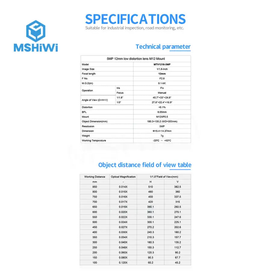 Specification: Model Number:MTV1218-5MP Focal Length:12mm Sensing Area:1/1.8" Low Distortion Industrial Lens with Standard industrial 12/S interface. Standard FA industrial M12/S interface. Fixed focus, manually adjustable aperture. High contrast, anti-vibration and low distortion. Both ODM and OEM are accepted;