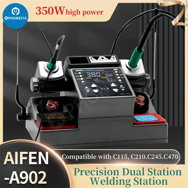AIFEN A902 soldering station with T115 T210 T245 welding handle and C115 C210 C245 soldering iron tips for Mobile Phone PCB Tablet BGA IC repair. 350W AIFEN A902 double welding BGA rework station with automatic sleep function and compatible with JBC C115 C210 C245 soldering iron tips, very suitable for daily mobile phone electronic components welding repair.