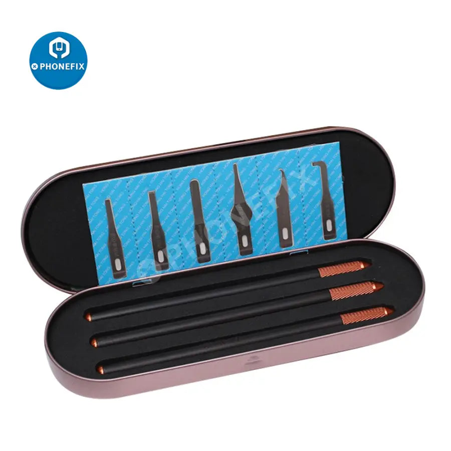 High-quality HONG HAI TONG blade with handle set for mobile phone motherboard CPU IC repair. Professional Phone Motherboard CPU IC glue removal blade set. Special steel shovel knife blade, used to disassemble layered chips and remove glue