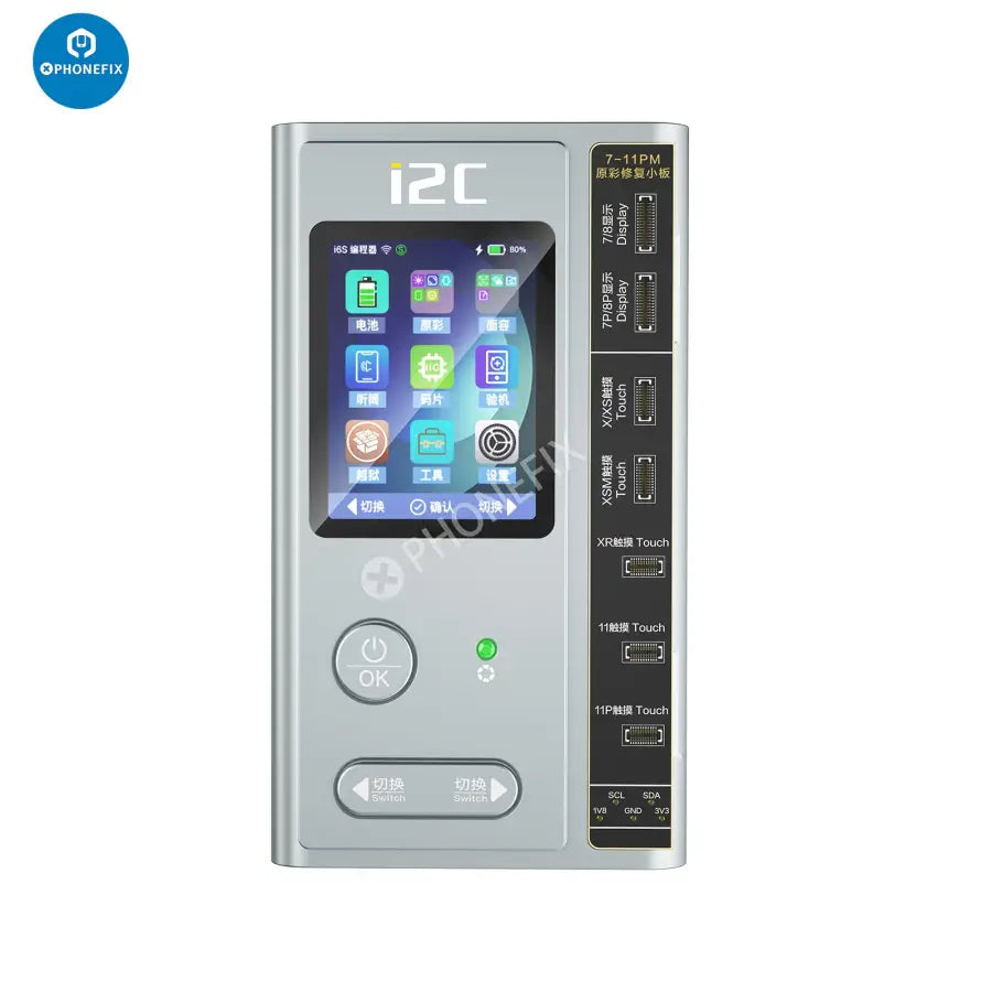 i2C i6S intelligent programmer for iPhone screen true tone/Face ID/battery/earpiece receiver flex cable/rear camera/headphone lightning cable/vibrator/fingerprint repair, one-click jailbreak IOS device. Multi-functional i2C i6S programmer for iPhone 6-15 Pro Max repair.