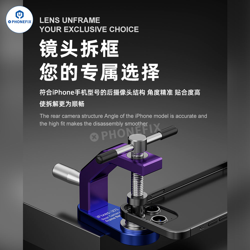 JTX CK9 and iFixes iX73 rear camera frame remover for iPhone X-15 Pro Max camera frame removal, no polishing required and no damage. iFixes iX73/JTX CK9 rear camera frame remover can easily disassemble the iPhone camera frame without causing any damage. It is suitable for iPhone rear camera frame replacement and is conducive to the subsequent replacement of iPhone back cover glass.